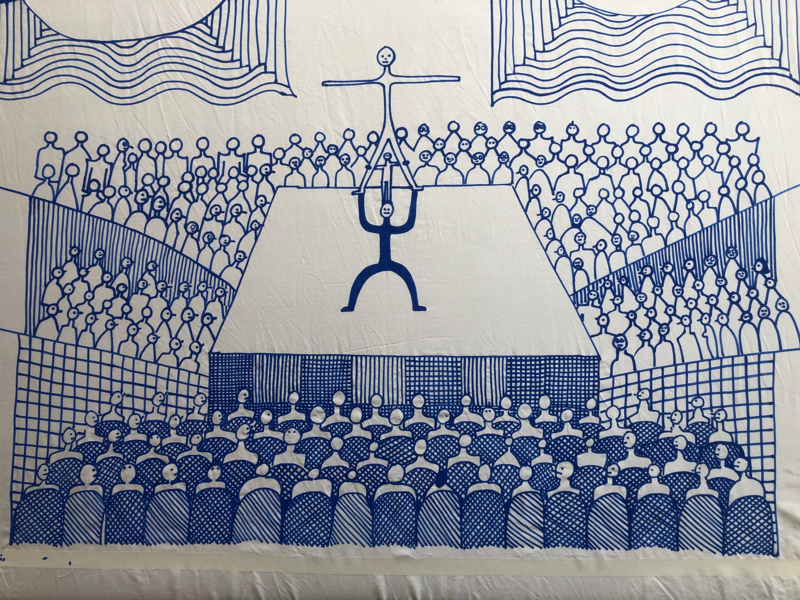Hennes utställning på Teatergrillen föddes med en idé om svävande mobiler i matsalen som skulle flyta över middagssällskapen. Ganska snart tog lokalens historia tag i henne och harlekiner och andra figurer från Commedia dell´arte började influera hennes bildvärld. I hennes vilja att förändra omgivningen för besökarna så tecknades även mönster på silkestyg som böljar i fönstren och på väggarna på Teatergrillen.